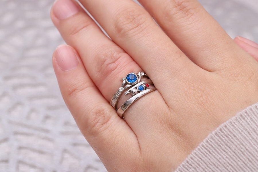 また同時に越前リョーマをイメージした2個セットのバースデーリングも発売決定!上段はカルピンをイメージした猫の形、下段はテニスボールが象られ、裏面には決め台詞が刻まれています。単体でも、上下を入れ替えても楽しめるデザインです。