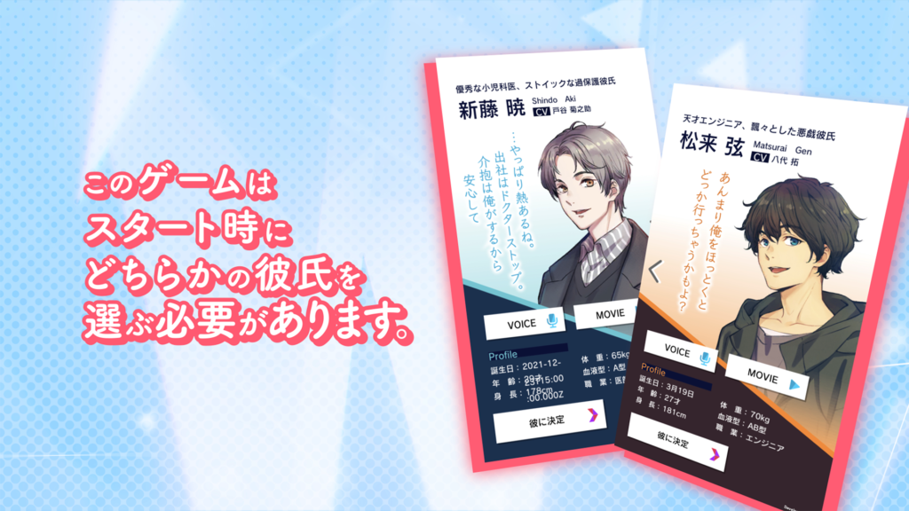 スマートフォン向けアプリ『束縛彼氏』は、「新藤 暁」(CV:戸谷菊之介)と「松来 弦」(CV:八代 拓)のふたりが登場します。ゲームスタートにどちらかひとりを選んでプレイします。