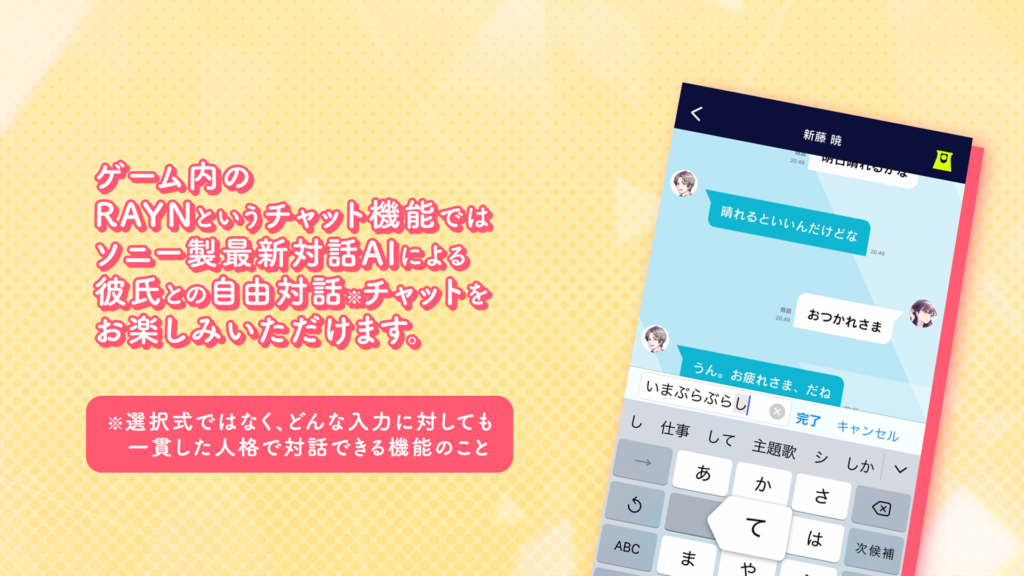 束縛彼氏は、ソニーが開発する『束縛AI対話システム』を起用し、キャラクターと選択式ではない、自由対話を楽しむことができます。