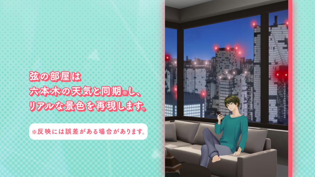六本木に住んでいる松来 弦の部屋からは素敵な景色が……。雨が降ったり、ビルにライトが点灯したりと実際の六本木の天候と連動します。