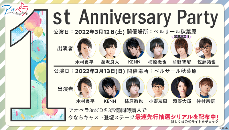 詳細は『アオペラ 』公式サイトの『アオペラ -aoppella!?- 1st Anniversary Party』特設ページをご参照下さい。