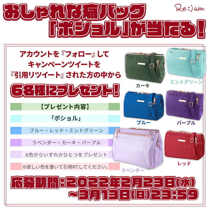 オタク女子専用カフェサロン「Ataraxia cafe(アタラキシアカフェ)」を運営するAirafu株式会社(アイラフ 大阪府浪速区)はオリジナルブランド「Re:)am(リラム)」から、大人気の「擬態しやすい痛バッグ」がま口斜めがけショルダーバッグ「ポショル」が当たるキャンペーンを公式Twitterにて実施致します。