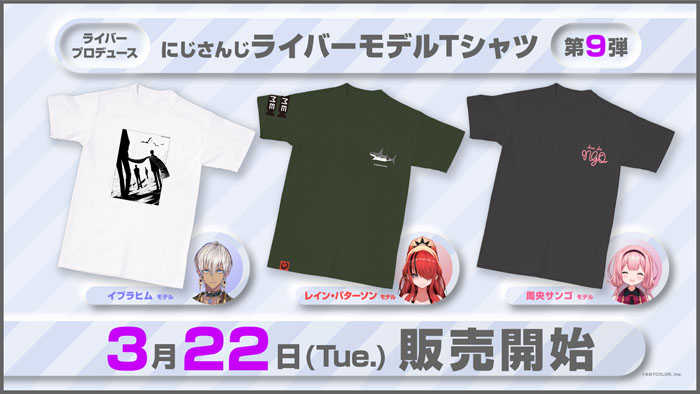 今回プロデュースに参加したライバーはイブラヒム、周央サンゴ、レイン・パターソンの3名。TシャツのサイズはL(着丈73cm / 身幅55cm / 肩幅50cm / 袖丈22cm)のみで、価格は各4000円(税込)。商品の発送は4月上旬以降となる予定だ。
