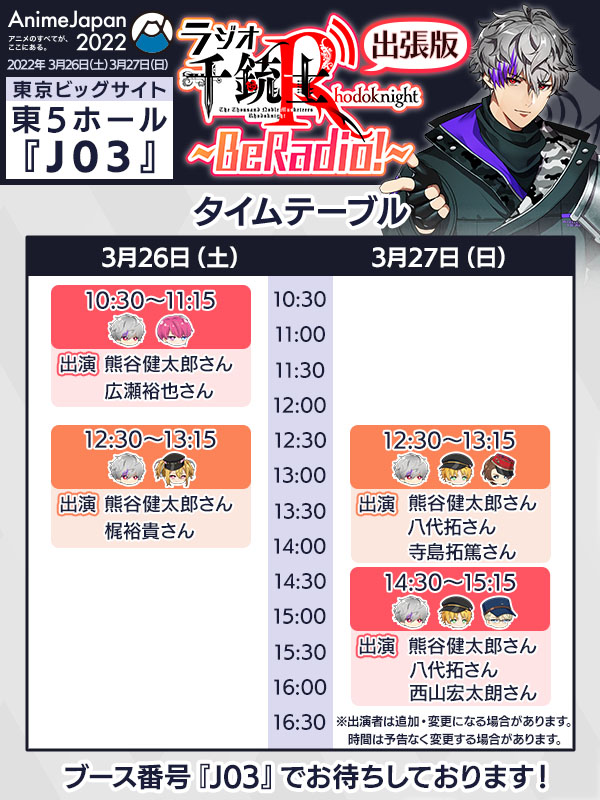 「千銃士:Rhodoknight」は3月26日(土)、27日(日)に東京ビッグサイトで開催される「AnimeJapan 2022」に参加し、声優6人による生ラジオ番組「千銃士:Rhodoknight~BeRadio!出張版」と題したリアルイベントを実施する。今回このタイムテーブルが公開されたほか、YouTubeライブによるラジオ番組の公開生配信が決定した。