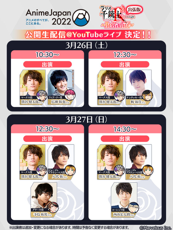 参加する声優は熊谷健太郎(マークス役)、広瀬裕也(ライク・ツー役)、八代拓(ジョージ&ブラウン・ベス役)、梶裕貴(ケンタッキー役)、寺島拓篤(グラース役)、西山宏太朗(ローレンツ役)の6名。ラジオでお馴染みのコーナーのほか、初解禁の情報なども聞けるという。