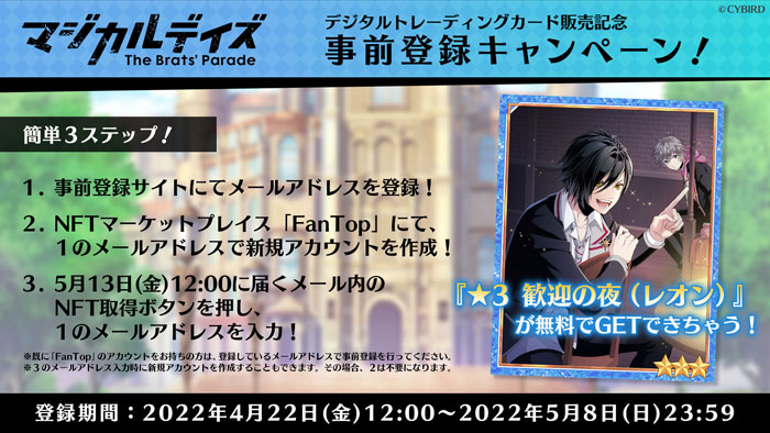 またデジタルトレカの販売開始を記念し、4月22日(金)12:00より、登録するだけで「マジカルデイズ」の人気キャラクター「レオン」の★3トレーディングカードが無料でもらえる事前登録キャンペーンがスタートしている。