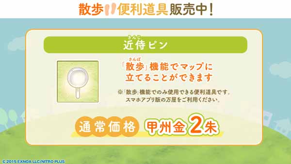 「散歩」はスマホアプリ版に実装された新たな機能で、端末の位置情報に基づくマップと現在地を参照しつつ、近侍と力を合わせてマップに「近侍ピン」を立て「歴Pt」と「近侍ピンPt」を集めるというもの。「歴Pt」と「近侍ピンPt」を集めることで、本丸と刀剣男士を成長させることができる。