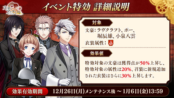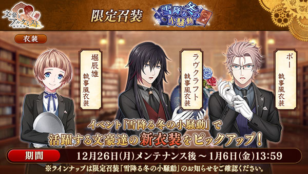 限定召装「雪降る冬の小騒動」では、調査任務「雪降る冬の小騒動」で活躍する「堀辰雄」「ラヴクラフト」「ポー」の新衣装を一定の確率で入手できる。