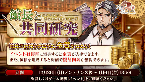 DMM GAMESの女性向け文豪転生シミュレーションゲーム『文豪とアルケミスト』において、2022年12月26日(月)よりイベント調査任務「雪降る冬の小騒動」と限定召装「雪降る冬の小騒動」が開催中。また、イベント「館長と共同研究」と新たな「冬」内装の販売が開始されている。