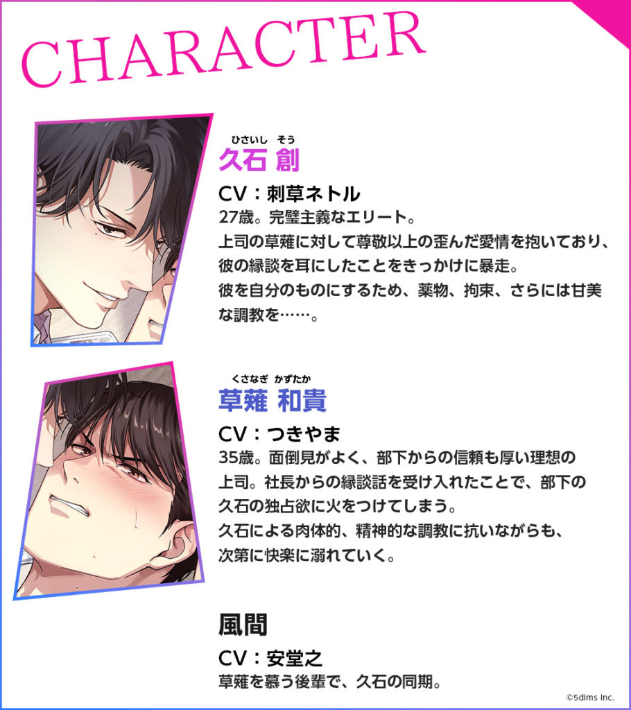 社内でも信頼の厚いプロジェクトリーダー・草薙和貴(cv.つきやま)は、よい縁談の話が来て、ついに身を固める決意をする。しかしそれを知った部下・久石創(cv.刺草ネトル)は、狂気的な独占欲に囚われて……。淫らな支配か、それとも愛か――二人の関係が崩れていく先に待つのは。